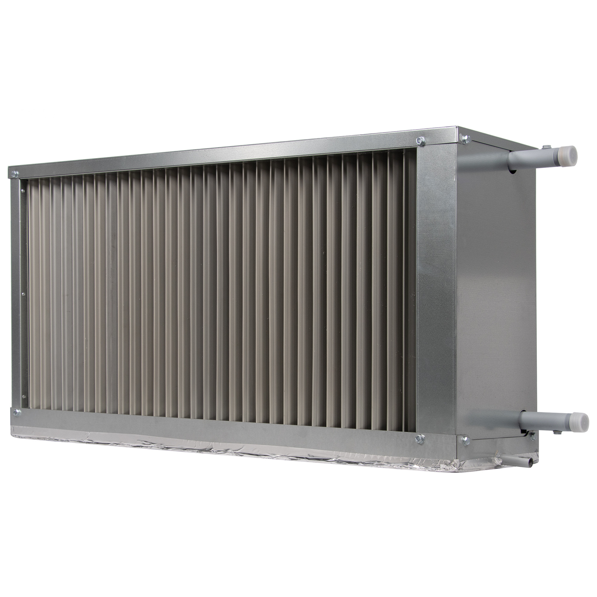 Теплообменник выполнен из медных труб с алюминиевым оребрением. Стандартно имеет трехрядное исполнение. Шаг оребрения составляет 2,1 мм (вместо общепринятого для наборных систем вентиляции 2,5 мм). Уменьшенный шаг позволяет существенно увеличить теплоотдачу и оптимизировать массогабаритные показатели при незначительном увеличении аэродинамического сопротивления теплообменника. Для увеличения теплоотдачи трубы механически расширены и тем самым жестко соединены с оребрением. Пайка калачей теплообменника осуществляется припоем с 2 % содержанием серебра, что обеспечивает высокое качество паяных деталей.