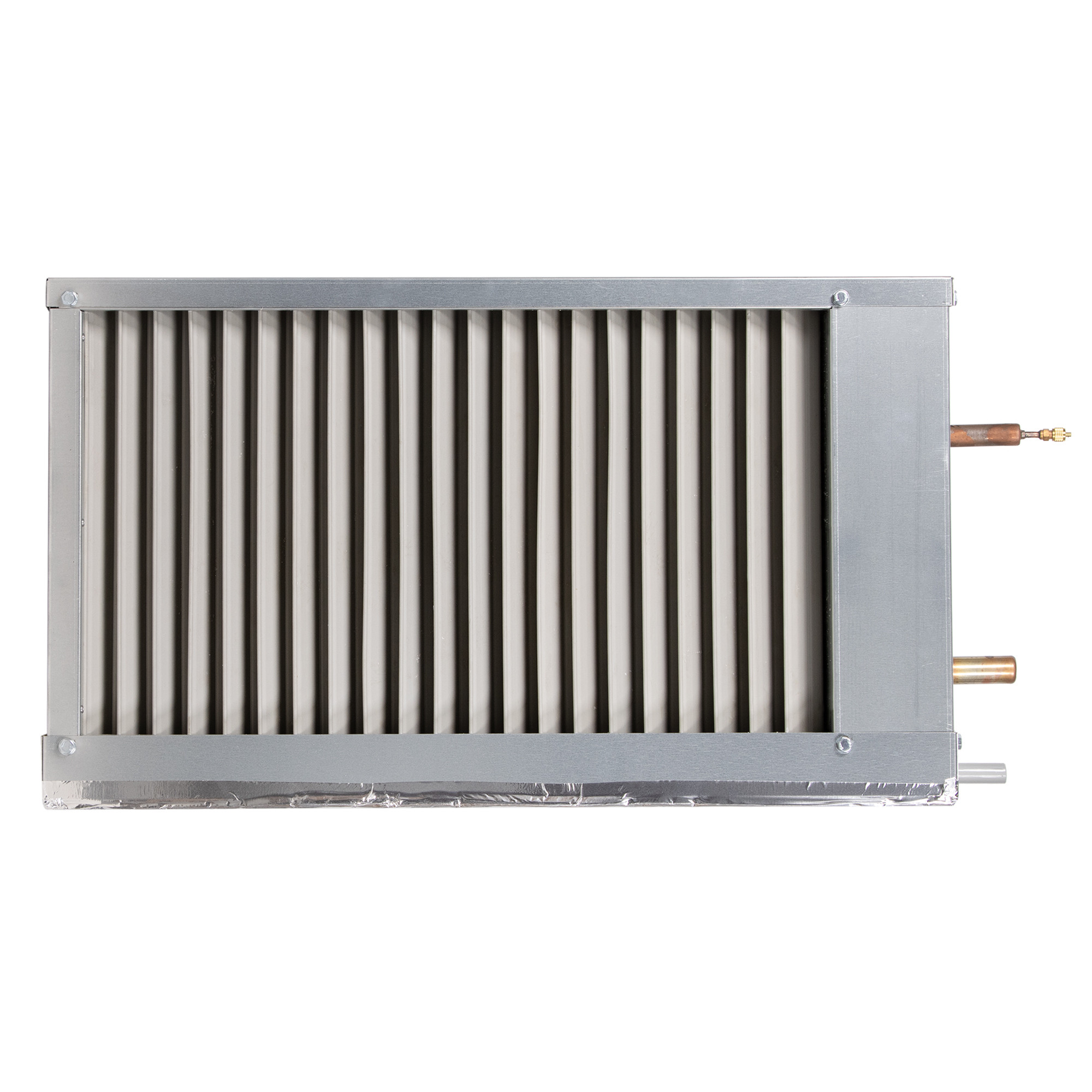 Теплообменник выполнен из медных труб с алюминиевым оребрением. Стандартно имеет трехрядное исполнение. Шаг оребрения составляет 2,1 мм (вместо общепринятого для наборных систем вентиляции 2,5 мм). Уменьшенный шаг позволяет существенно увеличить теплоотдачу и оптимизировать массогабаритные показатели при незначительном увеличении аэродинамического сопротивления теплообменника. Для увеличения теплоотдачи трубы механически расширены и тем самым жестко соединены с оребрением. Пайка калачей теплообменника осуществляется припоем с 2 % содержанием серебра, что обеспечивает высокое качество паяных деталей.
