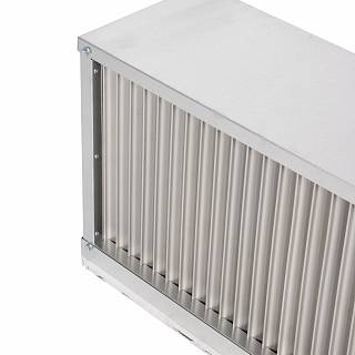 Теплообменник выполнен из медных труб с алюминиевым оребрением. Стандартно имеет трехрядное исполнение. Шаг оребрения составляет 2,1 мм (вместо общепринятого для наборных систем вентиляции 2,5 мм). Уменьшенный шаг позволяет существенно увеличить теплоотдачу и оптимизировать массогабаритные показатели при незначительном увеличении аэродинамического сопротивления теплообменника. Для увеличения теплоотдачи трубы механически расширены и тем самым жестко соединены с оребрением. Пайка калачей теплообменника осуществляется припоем с 2 % содержанием серебра, что обеспечивает высокое качество паяных деталей.